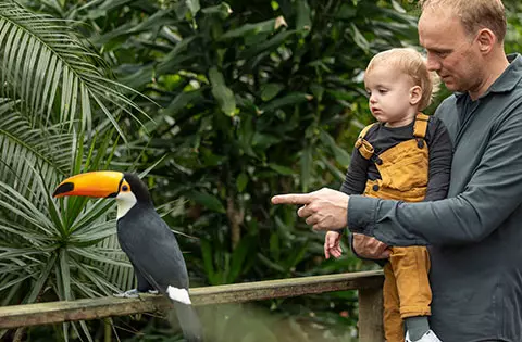 Enter Amazonia and discover a continent filled with adventures and exceptional encounters. In this magnificent rainforest, you can walk among the animals and giant palms. You can also make your voyage as adventurous as you want. You can stay on the main route for a tour along all highlights or you can wander off along the wilderness trails. Come eye to eye with the toucans, admire the metres-high Mexican fan palm, and discover which plant produces vanilla. However, watch out! Before you know it, a small monkey might lure you onto the rainforest’s floor where only a ramshackle rope bridge will guide you to a new adventure…